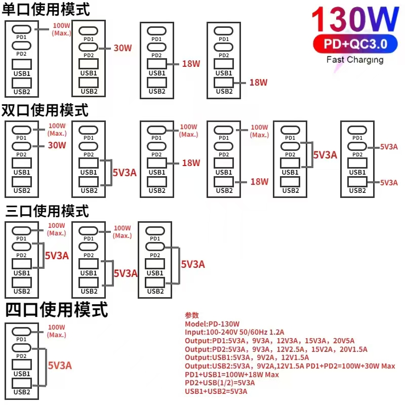 PD130W Flast Wall Charger Input:100-240V 1.5A 50/60HZ